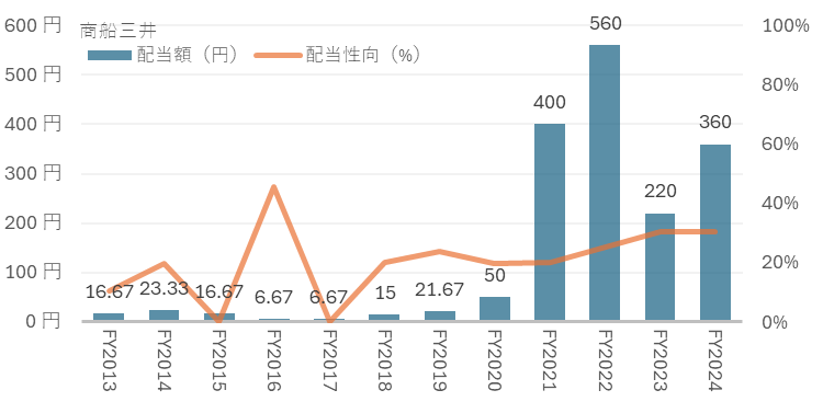 2026年3月期は配当性向を30%予定としています。また、下限配当を150円としています。日本郵船は配当性向40%と下限配当200円としており、相対的に分配には劣後しているといえるでしょう。